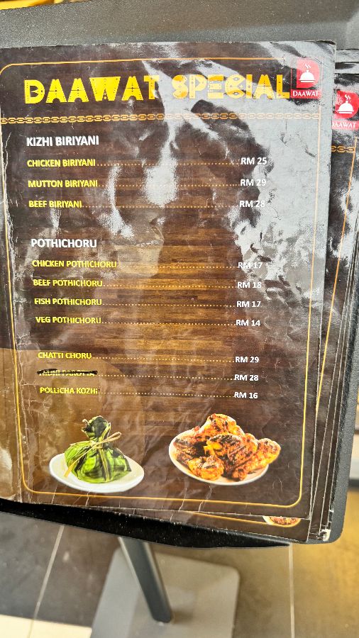 다와트에서는 양도 매우 푸짐하게 제공됩니다. 정통 케랄라 요리답게 아낌없이 재료를 사용하고, 넉넉한 인심으로 손님들의 만족도를 높입니다. 가격 또한 대부분의 메뉴가 매우 저렴하여, 훌륭한 맛과 푸짐한 양, 친절한 서비스까지 고려하면 가성비 또한 뛰어난 곳이라 할 수 있습니다. (다만 양고기 비리야니가 38링깃으로 다소 비싸게 느껴질 수 있다는 평도 있었으나, 전체적인 만족도와 다른 메뉴들의 합리적인 가격을 고려할 때 이는 예외적인 상황으로 보입니다.)