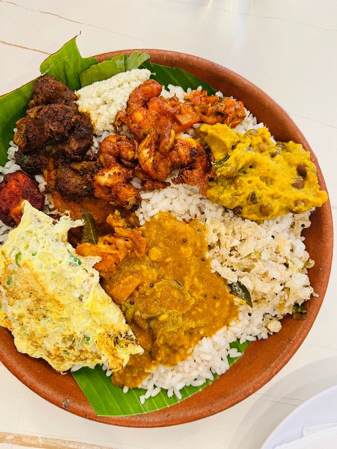 따뜻하게 갓 지은 밥을 중심으로, 각종 채소 커리, 달콤한 처트니, 상큼한 피클, 그리고 진한 그레이비 소스들이 정교하게 배치됩니다. 색색의 요리들이 바나나 잎 위에 어우러져 한 폭의 그림 같고, 코끝을 간지럽히는 향신료의 복합적인 향은 식욕을 자극하기에 충분합니다. 저는 오징어, 새우, 양고기 코코넛 로스트를 추가로 주문했는데, 그야말로 완벽한 선택이었습니다.