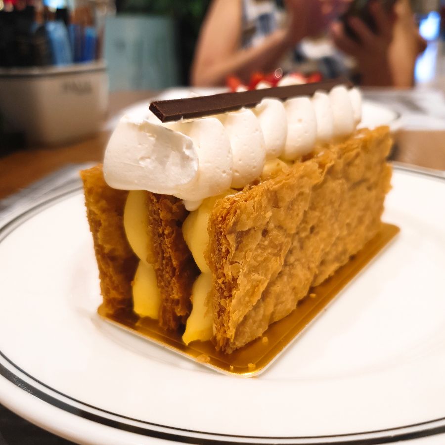 PAUL은 브런치뿐만 아니라, 눈과 입을 즐겁게 하는 다채로운 디저트들로도 유명합니다. 쿠알라룸푸르에서 먹어본 디저트 중 제일 괜찮다는 평을 받을 정도로, 그 맛과 품질은 의심할 여지가 없습니다. 특히, 바닐라 밀푀유는 겹겹이 쌓인 바삭한 페이스트리와 부드러운 바닐라 크림이 환상의 조화를 이루며, 한 입 베어 물면 달콤함이 입안 가득 퍼지는 행복감을 선사합니다. 깔끔하게 얹어진 휘핑크림과 초콜릿 장식은 보는 즐거움까지 더해줍니다.