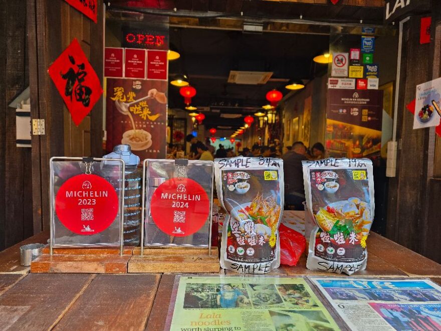 택시에서 내리자마자 풍겨오는 독특한 향신료 냄새가 코를 간지럽혔다. 식당 앞에는 이미 많은 사람들이 줄을 서서 기다리고 있었다. 빨간색 간판에 쓰인 한자와 영어로 된 상호명이 눈에 띄었다. 식당 입구에는 미슐랭 2023, 2024 선정 기념패가 자랑스럽게 놓여 있었다. 마치 “우리가 바로 그 맛집“이라고 말하는 듯했다.