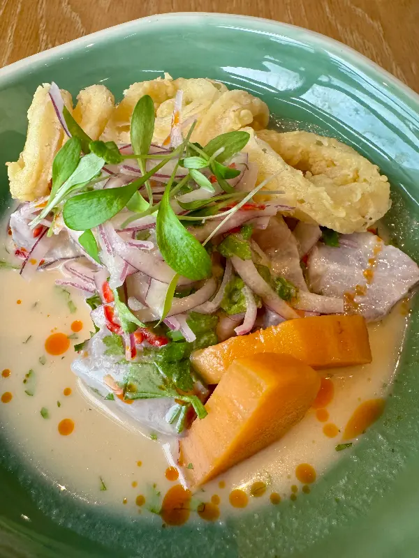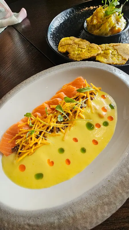 사진 속 세비체는 신선한 연어가 주재료로 사용된 듯하다. 노란색 소스와 초록색, 주황색의 작은 점들이 흩뿌려져 있어 시각적으로도 매우 흥미롭다. 얇게 슬라이스된 연어는 입에 넣는 순간 부드럽게 녹아내리고, 상큼한 소스는 입안 가득 퍼지는 풍미를 더한다. 튀긴듯한 면은 바삭한 식감을 더하여 맛의 균형을 잡아준다.