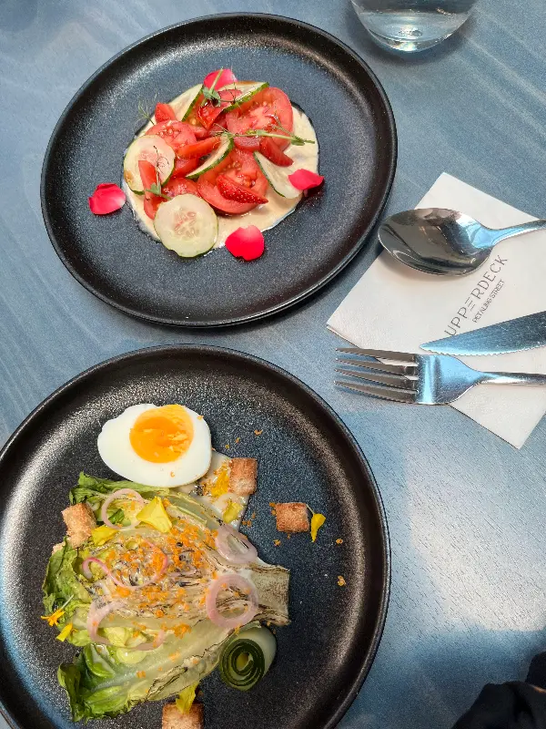 어퍼덱은 레이너 셰프의 섬세한 손길이 느껴지는 퓨전 요리로 유명하다. 그린 커리를 곁들인 연어 요리, 양고기, 새우 파스타 등 다양한 메뉴는 독창적인 맛과 아름다운 비주얼을 자랑한다. 특히 그린 커리 연어는 많은 사람들에게 사랑받는 메뉴라고 한다. 아쉽게도 이번 방문에서는 맛보지 못했지만, 다음 방문 때는 꼭 한번 맛보고 싶다.