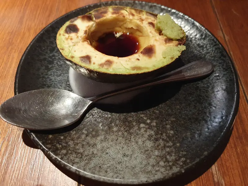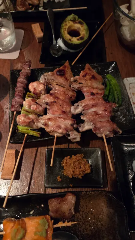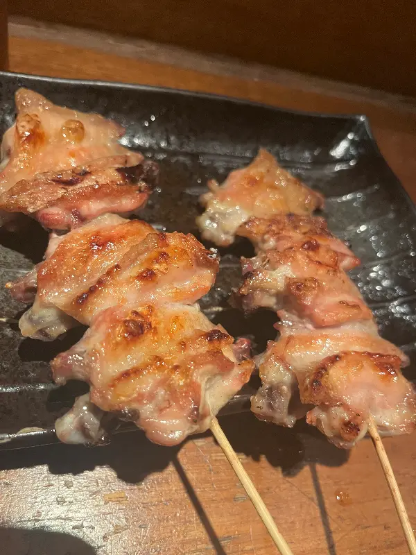 고심 끝에 몇 가지 꼬치를 주문했습니다. 가장 먼저 눈에 들어온 것은 닭 날개 야키토리. 꼬치 하나에 닭 날개가 세 조각씩 꽂혀 나오는데, 겉은 바삭하고 속은 촉촉하게 구워져 나왔습니다. 한 입 베어 무니 입안 가득 퍼지는 닭고기의 풍미와 짭짤한 양념의 조화가 훌륭합니다. 함께 제공되는 초록색 디핑 소스는 와사비처럼 보이지만 와사비가 아닌 독특한 맛을 선사합니다.