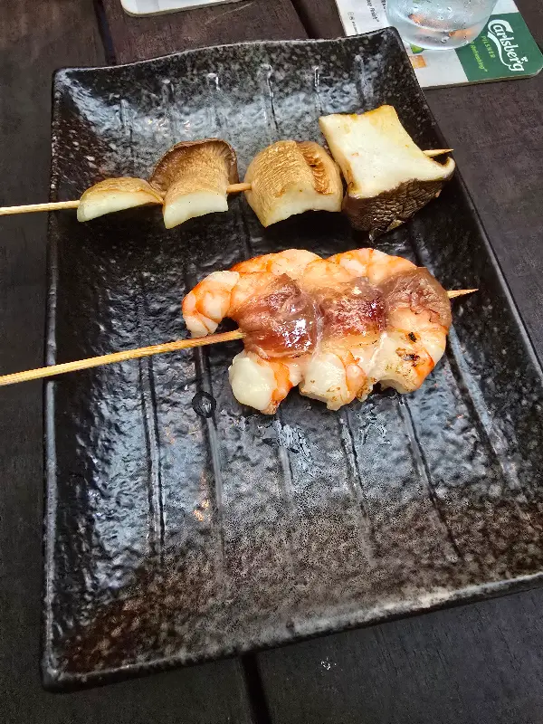 메뉴를 펼쳐보니 다양한 종류의 쿠시야끼(꼬치)가 눈에 띕니다. 돼지 목살, 닭 날개, 새우, 버섯 등 다양한 재료를 사용한 꼬치 요리가 준비되어 있습니다. 특히, 팔릴로스에서는 흔히 볼 수 없는 독특한 꼬치 요리들이 많아 더욱 기대감을 높입니다. 굽기의 정도와 적당한 양념의 조화가 완벽하다는 평처럼, 어떤 꼬치를 골라야 할지 행복한 고민에 빠집니다.
