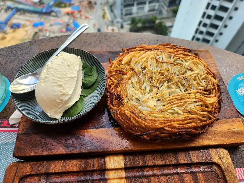 높은 곳에 위치한 만큼 뷰는 정말 훌륭했지만, 음식 맛은 가격 대비 평범했다는 의견도 있었습니다. 메인 메뉴에 가니쉬가 부족하여 다양하게 즐기려면 사이드 메뉴를 추가해야 한다는 점도 아쉬운 부분입니다.