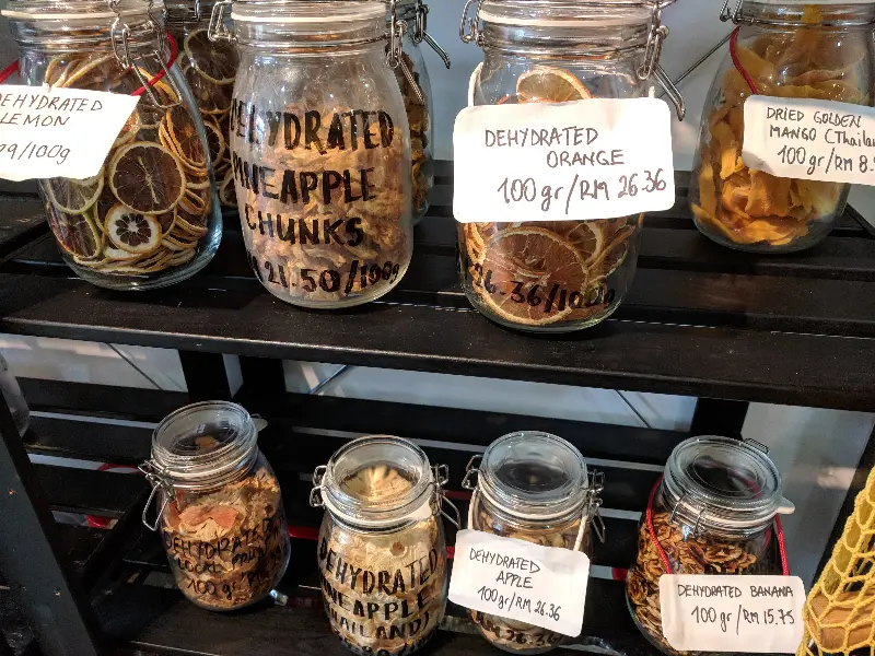 말린 과일 코너에는 레몬, 파인애플, 오렌지, 사과, 바나나 등 다양한 종류의 말린 과일들이 유리병에 담겨 있습니다. 100g당 가격이 표시되어 있어, 원하는 만큼 구매할 수 있습니다. 말린 과일은 간식으로 먹기에도 좋고, 차를 끓여 마실 때에도 활용할 수 있습니다.