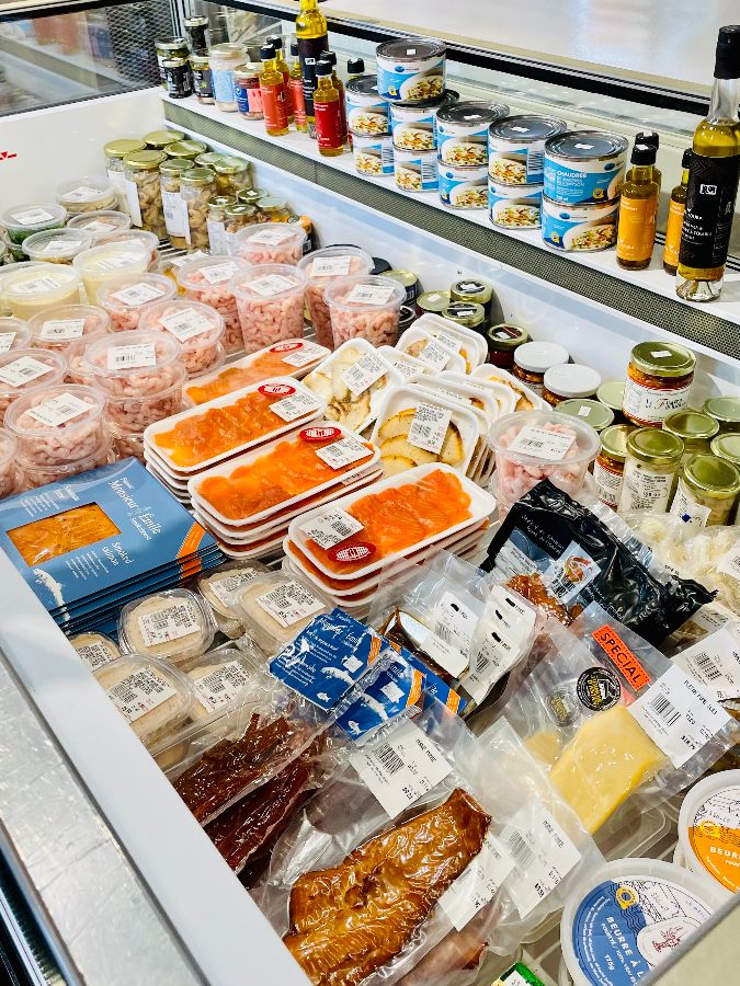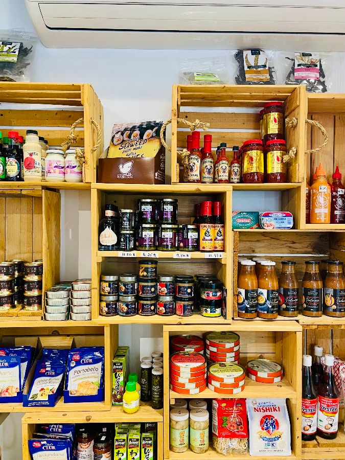 ‘Mon Poisson’은 신선한 해산물뿐만 아니라, 다양한 소스와 양념, 그리고 특별한 식재료들을 함께 판매하여 고객들이 집에서도 훌륭한 요리를 즐길 수 있도록 돕습니다. 진열된 나무 선반에는 알록달록한 소스병들과 통조림, 그리고 다양한 가공식품들이 빼곡하게 진열되어 있습니다. 이는 고객들이 구매한 신선한 해산물을 더욱 맛있게 즐길 수 있도록 돕는 일종의 미식 가이드와 같습니다.