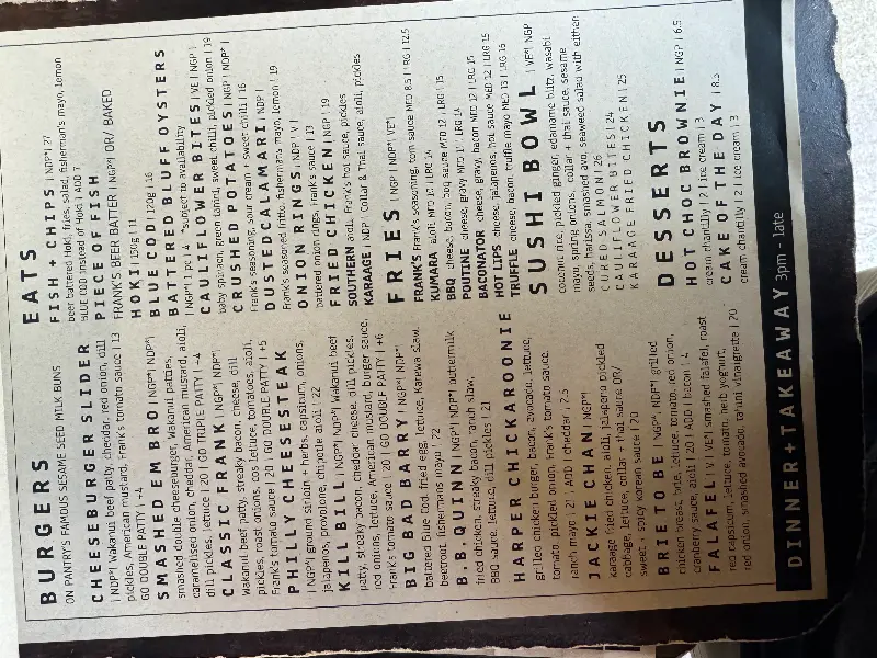Frank’s Eatery는 버거 외에도 다양한 메뉴를 제공하고 있었습니다. 메뉴판을 살펴보니, 클래식한 버거부터 독특한 조합의 버거, 샐러드, 파스타, 그리고 디저트까지 없는 게 없었습니다.