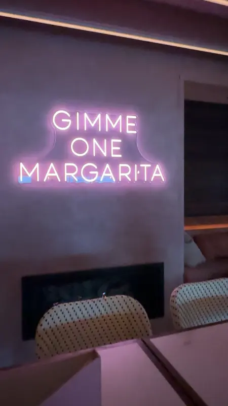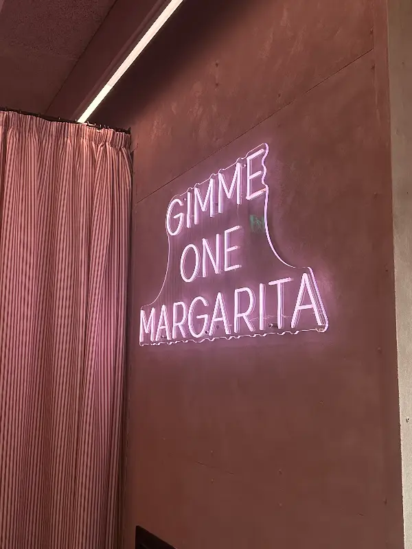 네온사인 간판이 시선을 사로잡는 토미스의 입구. “GIMME ONE MARGARITA” 문구가 칵테일에 대한 기대를 높인다.