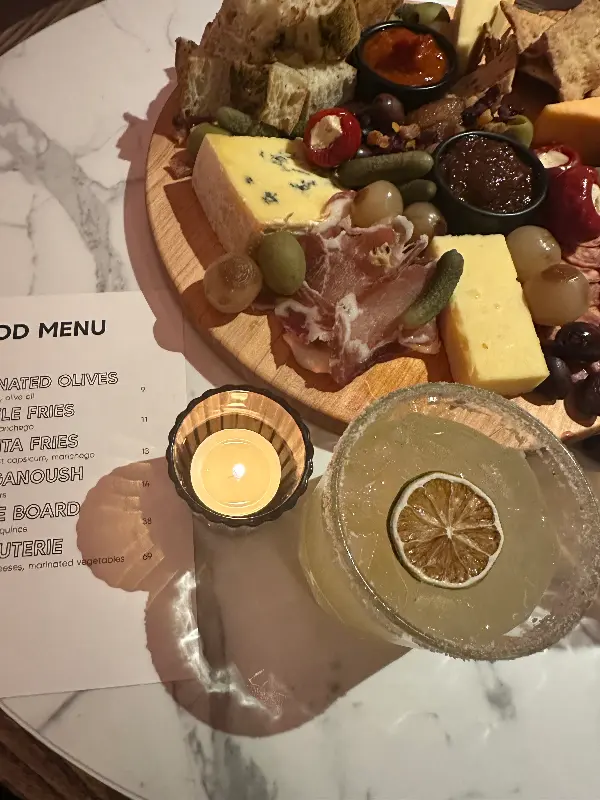 마가리타와 함께 즐기기 좋은 푸드 메뉴. 치즈, 햄, 올리브 등이 풍성하게 담겨 있어 칵테일과 완벽한 조화를 이룬다.