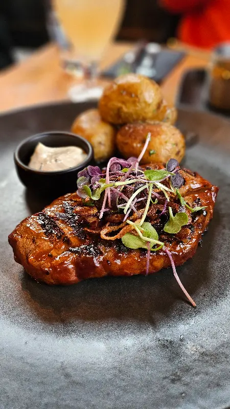 FLAME에서 꼭 맛봐야 한다는 립아이 스테이크도 빼놓을 수 없었다. 미디움 레어로 주문했는데, 겉은 바삭하고 속은 촉촉하게 구워져 나왔다. 칼로 스테이크를 자르는 순간, 육즙이 흘러나오는 모습에 감탄했다. 입에 넣으니 육즙이 팡팡 터지면서 입안 가득 퍼지는 풍미가 정말 환상적이었다. 곁들여 나온 버섯 소스와 함께 먹으니 더욱 깊은 맛을 느낄 수 있었다. “립스테이크+버섯소스?가 정말 맛있다!! 굽기 미디움 레어로 했고 정말 입에서 살살 녹음”이라는 리뷰가 과장이 아니었음을 실감했다.