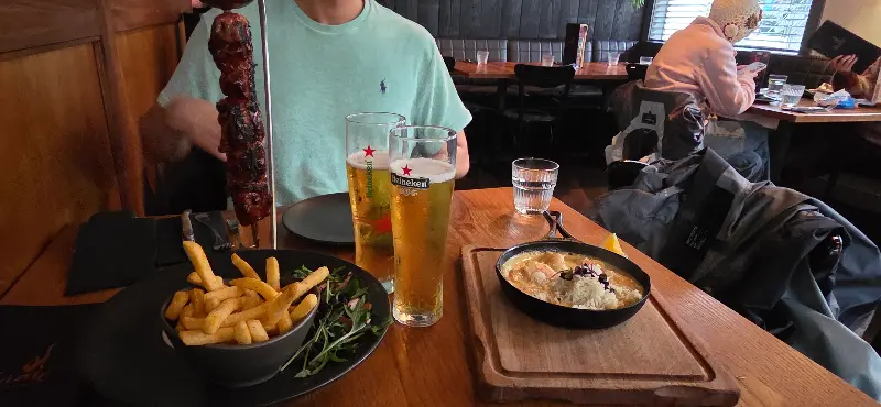 메뉴 선택에 고민이 많았지만, 여러 리뷰를 참고하여 양꼬치(Lamb Skewer)와 새우 라이스(Moz Prawns)를 주문했다. 먼저 등장한 양꼬치는 겉은 바삭하고 속은 촉촉한 완벽한 조화를 이루었다. 양고기 특유의 냄새는 전혀 느껴지지 않았고, 입안에서 살살 녹는 듯한 부드러운 식감이 일품이었다. “양고기는 양 냄새가 정말 안 나는 편이고, 너무 맛있어요.”라는 리뷰처럼, 양고기를 즐기지 않는 사람도 부담 없이 먹을 수 있을 것 같았다.