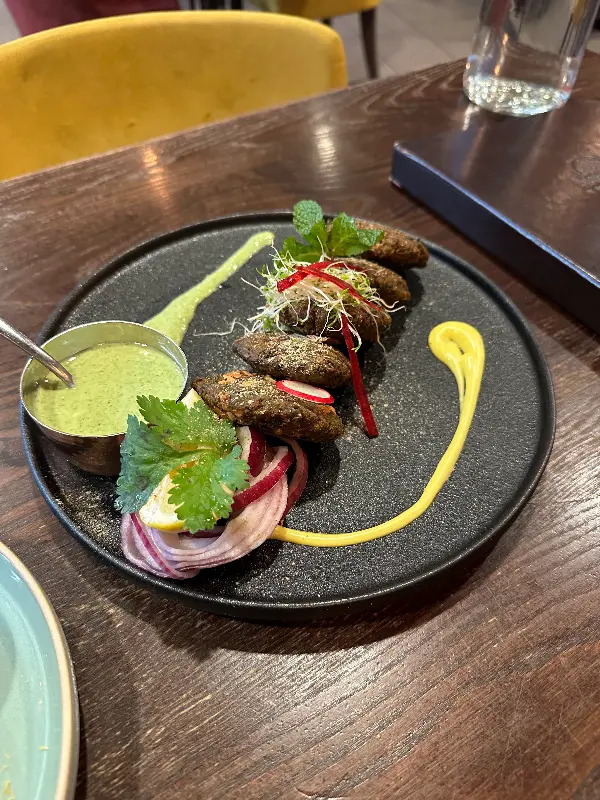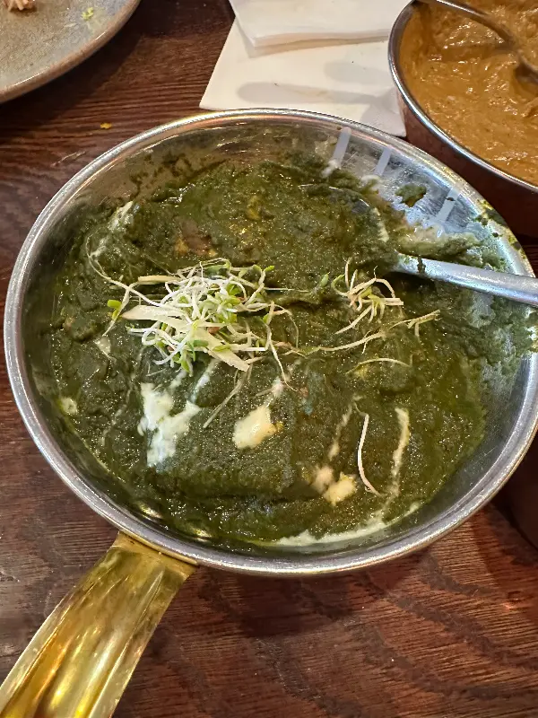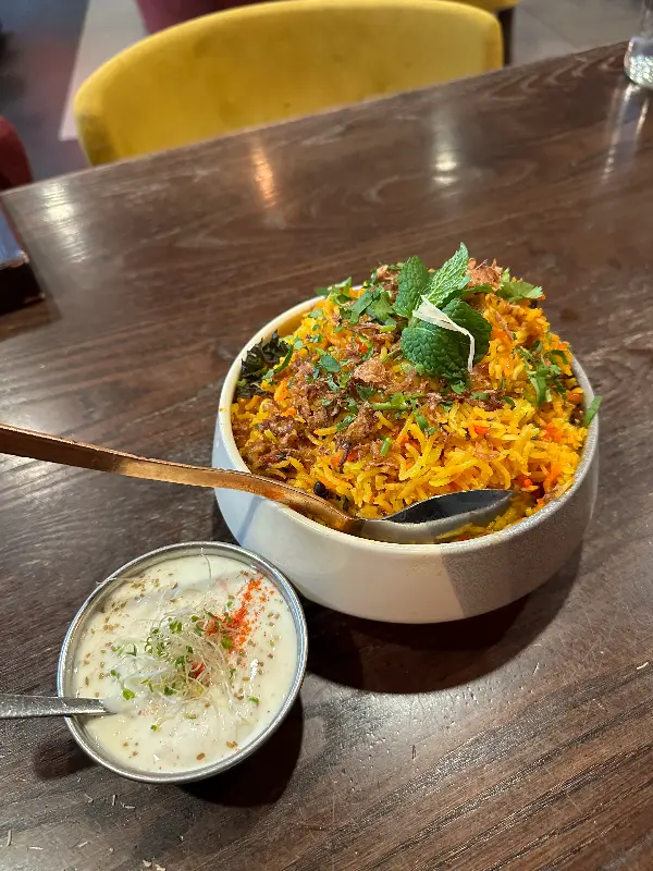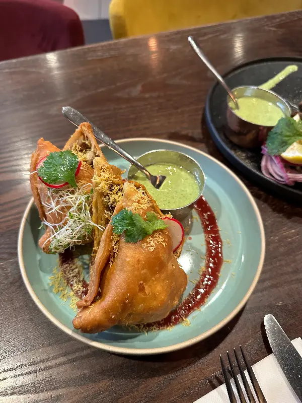 기대감 속에 드디어 주문한 음식이 테이블에 놓였다. 우리는 버터 치킨, 램 빈달루, 치킨 비리야니, 갈릭 난, 어니언 바지를 주문했는데, 알록달록한 색감과 풍성한 향신료 향이 시각과 후각을 자극하며 식욕을 돋우었다. 특히, 처음 맛보는 인도 음식에 대한 설렘과 기대감이 컸다.