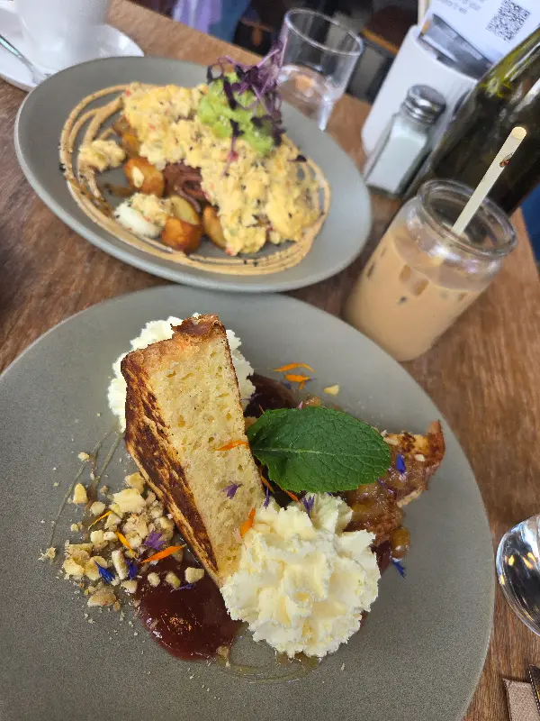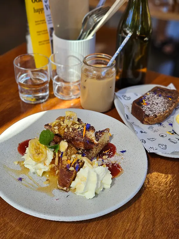 Odd Saint에서 가장 인기 있는 메뉴 중 하나는 단연 프렌치 토스트입니다. 사진(Image 1)에서 보이는 것처럼, 촉촉하고 부드러운 빵 위에 달콤한 시럽과 신선한 과일, 부드러운 크림이 듬뿍 올려져 있습니다. 한 입 베어 무는 순간, 입안 가득 퍼지는 달콤함과 부드러움에 감탄사가 절로 나옵니다. 특히 빵의 겉은 살짝 바삭하고 속은 촉촉한 완벽한 조화는 Odd Saint만의 특별한 비법일 것입니다. 함께 제공되는 바나나 브레드 역시 평범함을 뛰어넘는 훌륭한 맛을 자랑합니다. 한국에서 흔히 먹던 퍽퍽한 식감의 바나나 브레드와는 차원이 다른, 촉촉하고 풍부한 맛이 일품입니다.