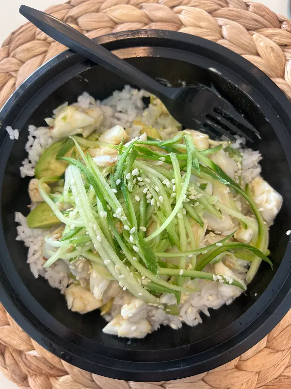 크랩 포케 볼은 이곳의 숨겨진 보석 같은 메뉴다. 신선한 게살이 아낌없이 들어간 포케 볼은, 한 입 베어 무는 순간 입안 가득 풍성한 맛이 퍼져 나갔다. 장어 소스를 빼고 주문했지만, 따로 제공된 소스 또한 훌륭했다. 밥 위에 듬뿍 올려진 게살과 아보카도, 신선한 채소들의 조화는 완벽했다. 마치 바다를 통째로 삼킨 듯한 신선함과 풍미는 잊을 수 없는 경험이었다. 이미지에서 보이는 것처럼, 밥 위에 푸짐하게 올라간 게살, 아보카도, 오이, 그리고 깨의 조화는 시각적으로도 훌륭했다.