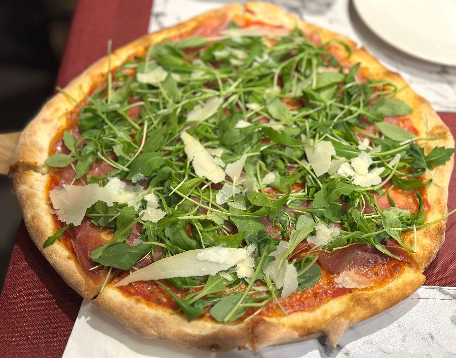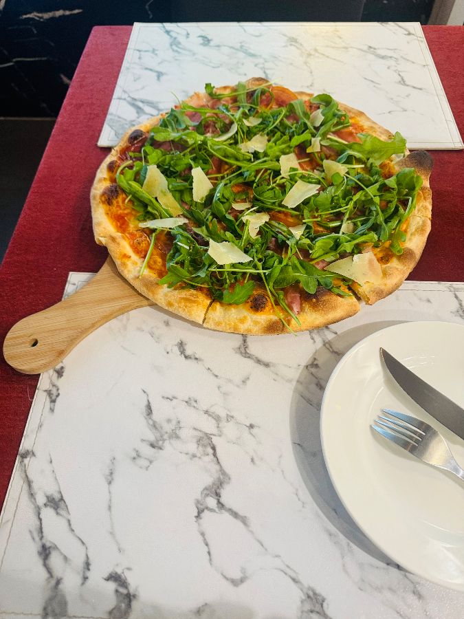 다른 날 방문했을 때 맛보았던 포르케타 피자 또한 훌륭했습니다. 얇고 바삭한 도우 위에 신선한 토핑이 듬뿍 올려져 있었고, 특히 깻잎은 방금 딴 것처럼 신선했습니다. 두 명이 먹어도 충분할 정도로 양도 푸짐했습니다.