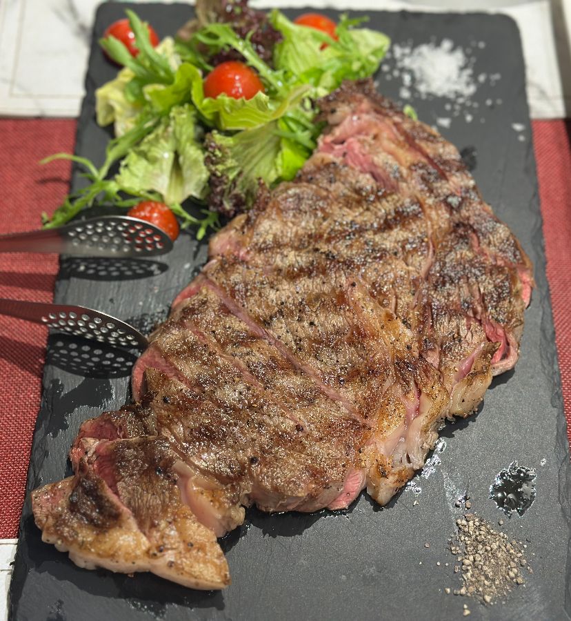 스테이크는 겉은 바삭하고 속은 촉촉하게 구워져 나왔습니다.