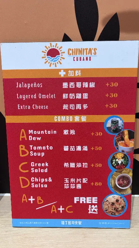 Chinita’s Cubano에서는 다양한 크기의 샌드위치와 토마토 수프를 선택할 수 있습니다. 좀 더 풍성하게 즐기고 싶다면 일반 사이즈를, 가볍게 맛보고 싶다면 작은 사이즈를 선택하면 됩니다. 또한, 그릭 샐러드나 다양한 추가 재료를 통해 나만의 특별한 조합을 만들 수도 있습니다.