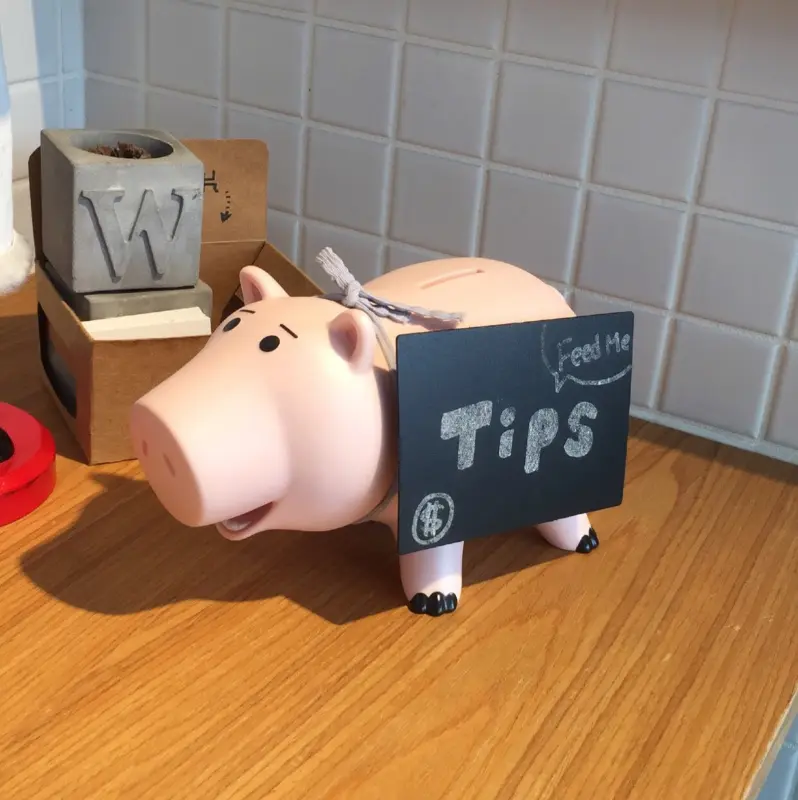 테이블 위에 놓인 팁 박스는 작은 돼지 저금통 모양으로, “Feed Me Tips”라는 문구가 적혀 있어 미소를 자아냅니다.