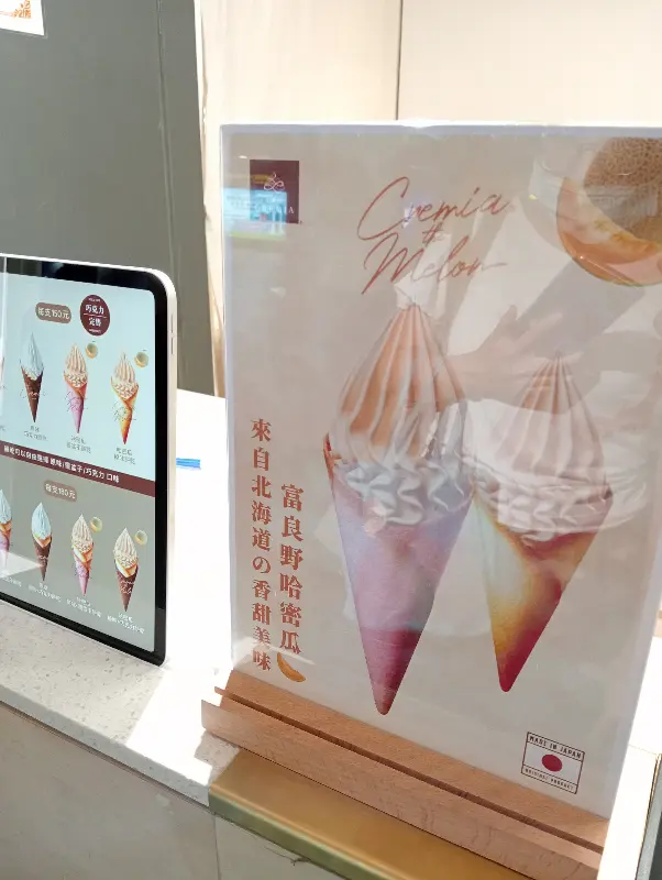 쇼케이스 옆에는 멜론 맛을 홍보하는 안내판이 놓여 있었습니다. 일본어로 “홋카이도산 유바리 멜론 사용”이라고 적혀 있는 것을 보니, 멜론 맛에 대한 기대감이 더욱 커졌습니다.