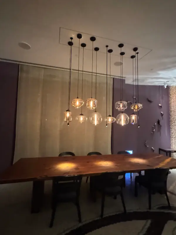 레스토랑 내부는 화려하면서도 편안한 분위기를 자아냈습니다. 은은한 조명이 테이블 위를 부드럽게 감싸고, 고급스러운 테이블 세팅은 특별한 식사를 위한 준비를 마친 듯했습니다. 천장에는 독특한 디자인의 조명들이 빛을 발하고 있었는데, 각각 다른 모양의 유리 갓에서 흘러나오는 빛이 나무 테이블 위를 따뜻하게 비추는 모습이 인상적이었습니다.
