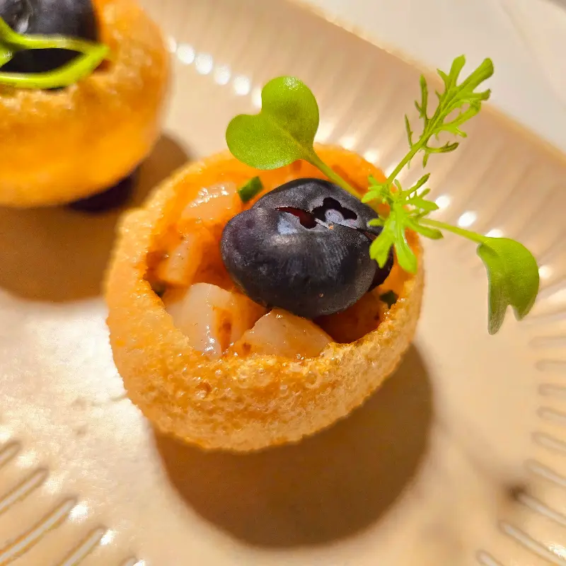 애피타이저는 정말 창의적이고 기억에 남을 만큼 맛있었다. 완전히 새로운 맛의 조합은, 미각을 자극하며 다음 요리에 대한 기대감을 높였다. 톡톡 터지는 식감이 재미있는 작은 볼 위에 올려진 블루베리와 허브 잎은 신선함을 더했다. 한입에 쏙 들어가는 크기였지만, 그 안에는 다양한 맛과 향이 응축되어 있었다.