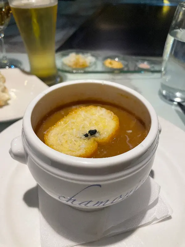 애피타이저가 등장하는 순간, 감탄사가 절로 나왔습니다. 마치 예술 작품을 감상하는 듯한 아름다운 플레이팅은 시각적인 즐거움을 선사했습니다. 신선한 샐러드와 함께 제공된 에피타이저는 입맛을 돋우기에 충분했습니다. 특히, 버섯 샐러드는 신선한 버섯의 풍미와 드레싱의 조화가 훌륭했습니다. 따뜻한 어니언 스프는 깊고 풍부한 맛으로 속을 따뜻하게 채워주었습니다. 이미지 속 어니언 스프는 빵 한 조각이 따뜻하게 녹아 있어 부드러움과 바삭함이 공존하는 매력을 뽐냅니다. 전반적으로 훌륭한 식사라는 평처럼, 메인 요리가 나오기 전부터 기대감을 한껏 높였습니다.
