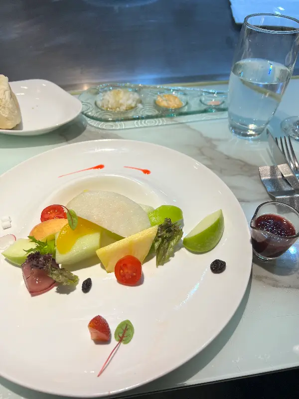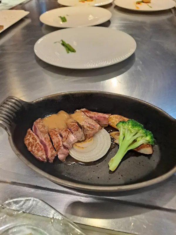 드디어 메인 요리가 등장했습니다. 저는 양갈비를, 친구는 갈릭 스테이크를 선택했습니다. 셰프의 화려한 손놀림과 함께 철판 위에서 구워지는 스테이크는 눈과 귀를 즐겁게 했습니다. 특히 오리 스테이크는 화려한 불쇼와 함께 제공되어 시선을 사로잡았습니다.