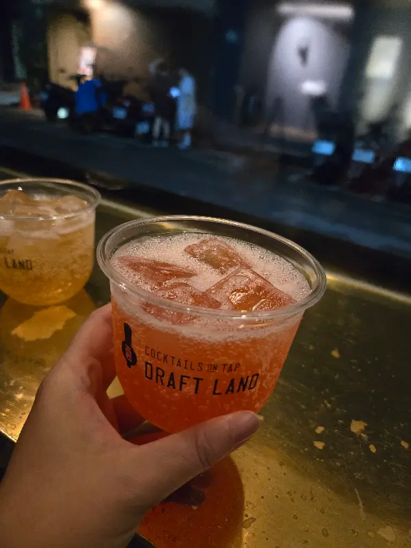드래프트 랜드의 가장 큰 매력은 바로 18가지 종류의 칵테일을 탭으로 즐길 수 있다는 점이다. 마치 생맥주처럼 탭에서 칵테일을 받아 마시는 경험은 신선하고 흥미롭다. 칵테일은 미리 만들어져 있어 주문 즉시 제공되므로, 기다리는 시간 없이 바로 음료를 즐길 수 있다.