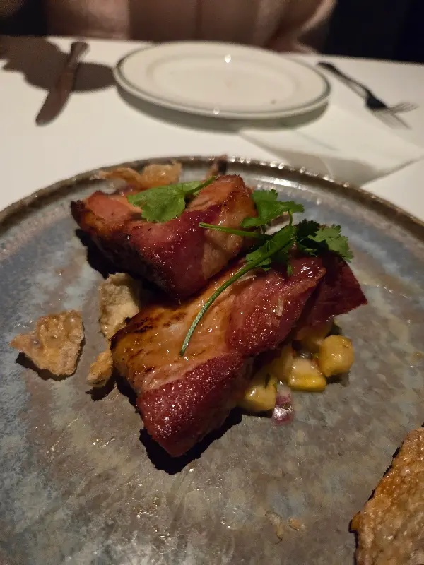 곧이어 나온 ‘두툼하게 썬 베이컨’은 비주얼부터 압도적이었습니다. 마치 중국식 삼겹살찜처럼 보이는 모습이 흥미로웠는데, 훈제 향이 은은하게 퍼지는 것이 정말 매력적이었습니다. 베이컨은 짜지 않고 훈제 향이 딱 적당했으며, 지방 부분은 전혀 느끼하지 않고 살코기 부분은 촉촉했습니다. 특히 살짝 매콤한 파인애플 소스와 바삭하게 튀긴 돼지껍데기가 더해져 풍미를 한층 끌어올려 주었습니다.