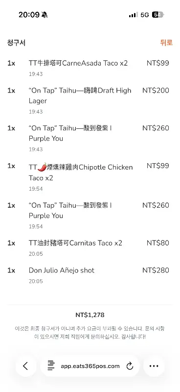 타코의 크기는 생각보다 작은 편이었지만, 다양한 재료들이 아낌없이 들어가 있어 맛은 정말 풍성했다. 타코 하나당 가격은 NT$100 정도인데, 1인당 최소 주문 금액이 NT$500이라는 점을 고려하면, 여러 종류의 타코를 맛보는 것이 좋을 것 같다.