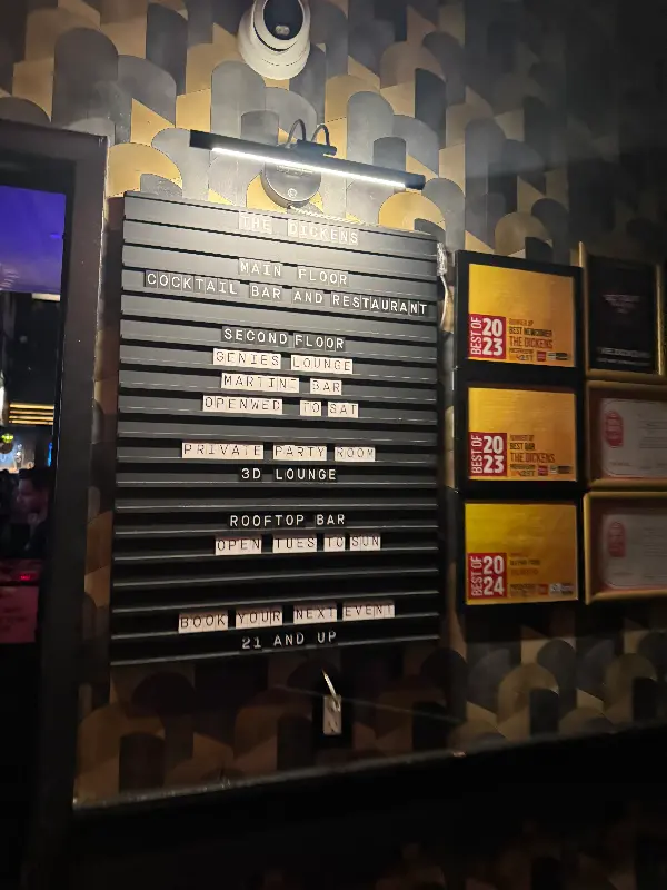 The Dickens에 들어서는 순간, 3층으로 이루어진 독특한 구조가 눈길을 사로잡는다. 각 층마다 다른 분위기를 연출하여 방문객들에게 다채로운 경험을 선사한다. 1층은 좀 더 조용한 분위기에서 담소를 나누기에 좋고, 위층으로 올라갈수록 활기 넘치는 바의 분위기를 느낄 수 있다. 특히, 도시의 아름다운 전망을 감상할 수 있는 루프탑 공간은 빼놓을 수 없는 매력 포인트다.