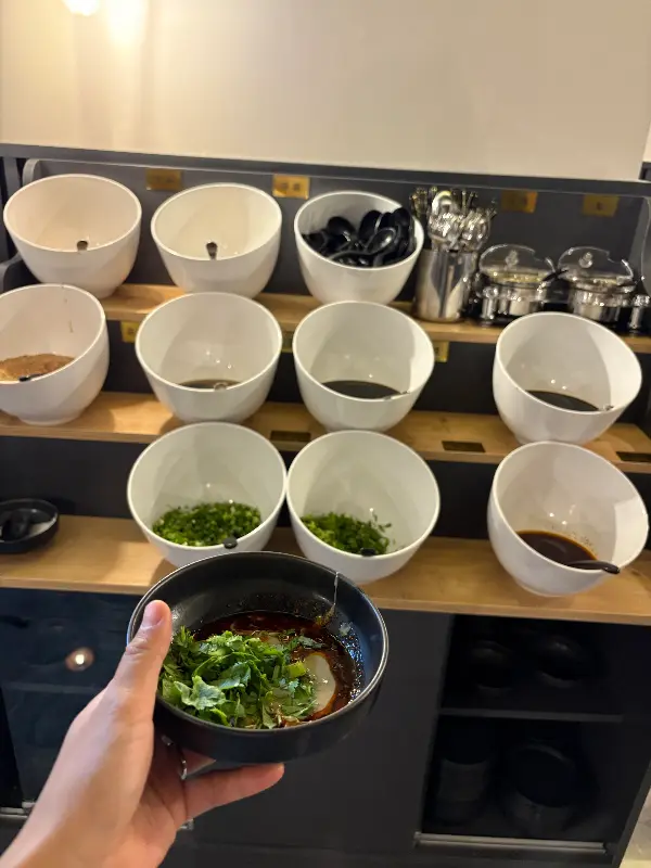 Asian Mom Hot Pot에서는 자신만의 특별한 소스를 만들어 먹을 수 있다는 점이 매력적이다. 테이블 한 켠에는 다양한 소스 재료들이 준비되어 있다. 간장, 참기름, 다진 마늘, 고추기름, 파 등 다양한 재료들을 섞어 자신만의 황금 비율을 찾아내는 재미가 쏠쏠하다.