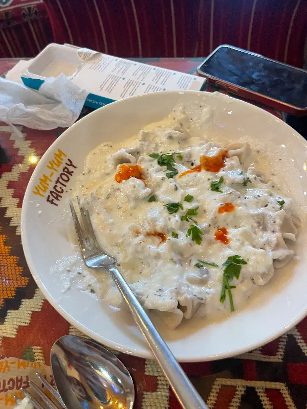 다음으로 맛본 것은 터키 전통 음식인 만티였다. 얌얌 팩토리의 만티는 겉은 쫄깃하고 속은 부드러운 만두피 안에 고소한 고기 소가 가득 차 있었다. 특히 요거트 소스와 함께 먹으니 더욱 깊은 풍미를 느낄 수 있었다. 만티 위에 뿌려진 파프리카 가루는 매콤한 맛을 더해 느끼함을 잡아주었다.