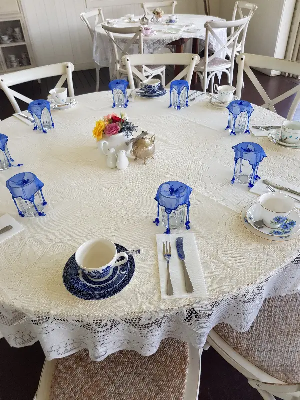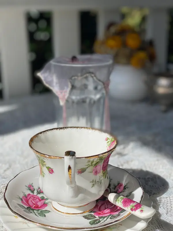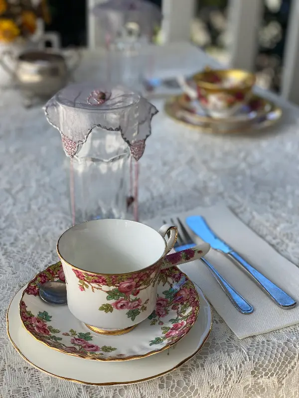 햇살 아래 반짝이는 섬세한 티 컵 세트, 레이스 테이블보와 어우러져 우아함을 더합니다.