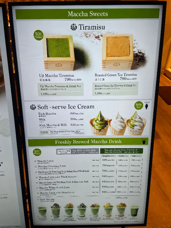 자리에 앉아 메뉴판을 펼쳐보니, 다양한 말차 음료와 디저트가 눈길을 사로잡습니다. 말차 라떼, 말차 아이스크림은 물론, 말차 티라미수, 말차 젤리 등 다채로운 메뉴 구성은 말차를 사랑하는 사람들에게는 천국과 같습니다.