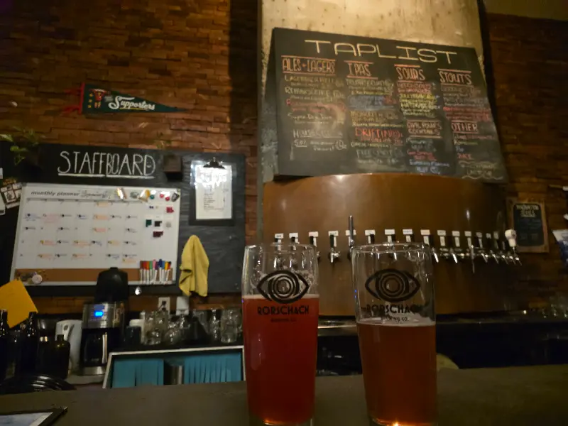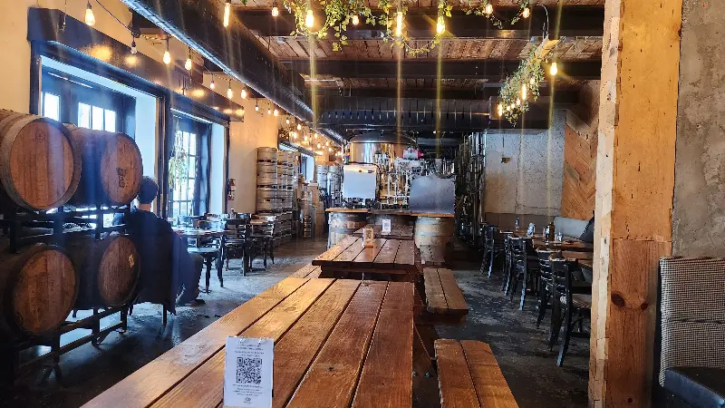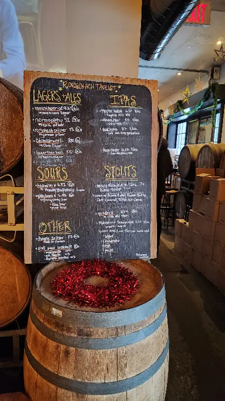 근처 바를 찾다가 우연히 뢰르샤흐 브루잉을 발견했다는 한 고객은, 밖에서 보기에는 넓어 보이지만 내부는 약간 허름한 느낌이라고 솔직하게 평했습니다. 하지만 그는 곧 “캐주얼”이라는 단어가 더 적절할지도 모르겠다고 덧붙였습니다. 평일 저녁에 방문해서 꽤 조용했는데, 나무 테이블과 의자들이 편안한 분위기를 더해줬다고 합니다. 그는 뢰르샤흐 브루잉의 소박하면서도 정감 있는 분위기에 매료되었다고 하네요.