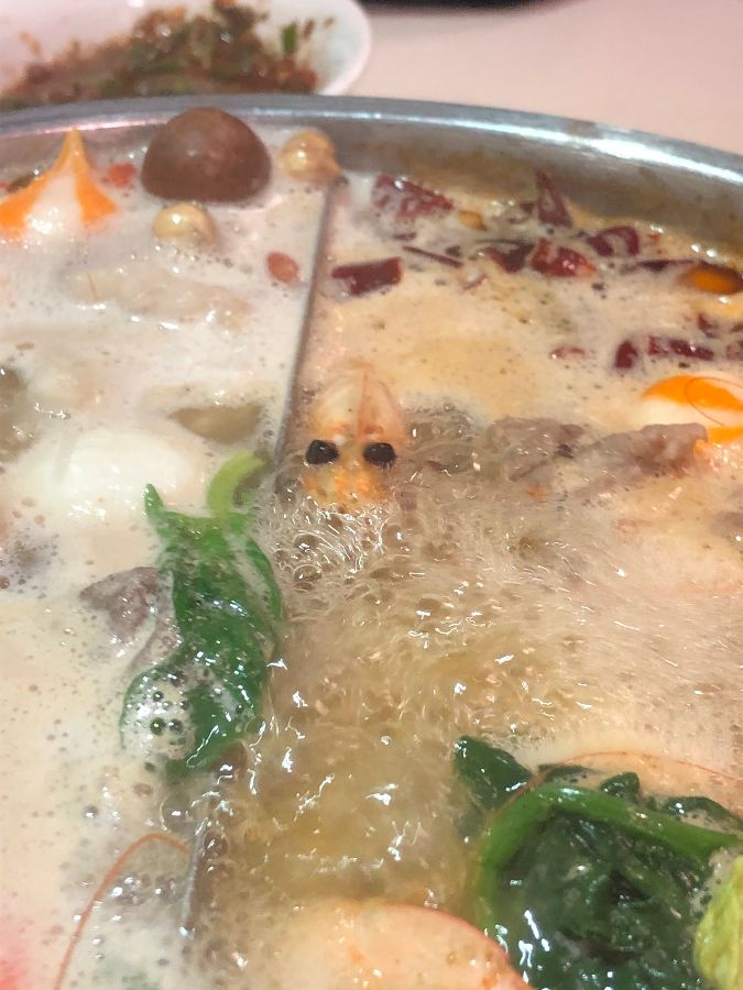 보글보글 끓어오르는 훠궈 육수 속에서 새우와 다양한 재료들이 익어갑니다. 특히 새우의 눈이 귀엽게 느껴집니다.