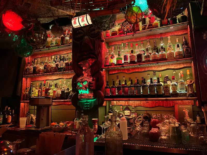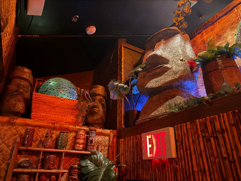 벽면을 가득 채운 티키 조각상, 은은하게 빛나는 조명, 그리고 흘러나오는 이국적인 음악은 마치 다른 세계에 온 듯한 착각을 불러일으킵니다. 특히 인상적인 것은 거대한 티키 석상입니다. 자세히 살펴보면 석상의 표정 하나하나가 살아있는 듯 생생하며, 공간 전체에 신비로운 분위기를 더합니다. 방문자들은 단순히 술을 마시는 것이 아니라, 티키 문화라는 새로운 세계를 탐험하는 듯한 특별한 경험을 하게 됩니다.