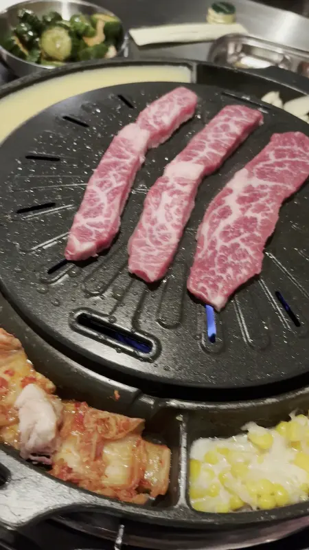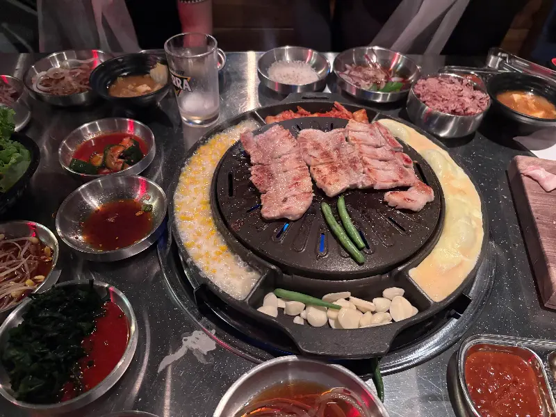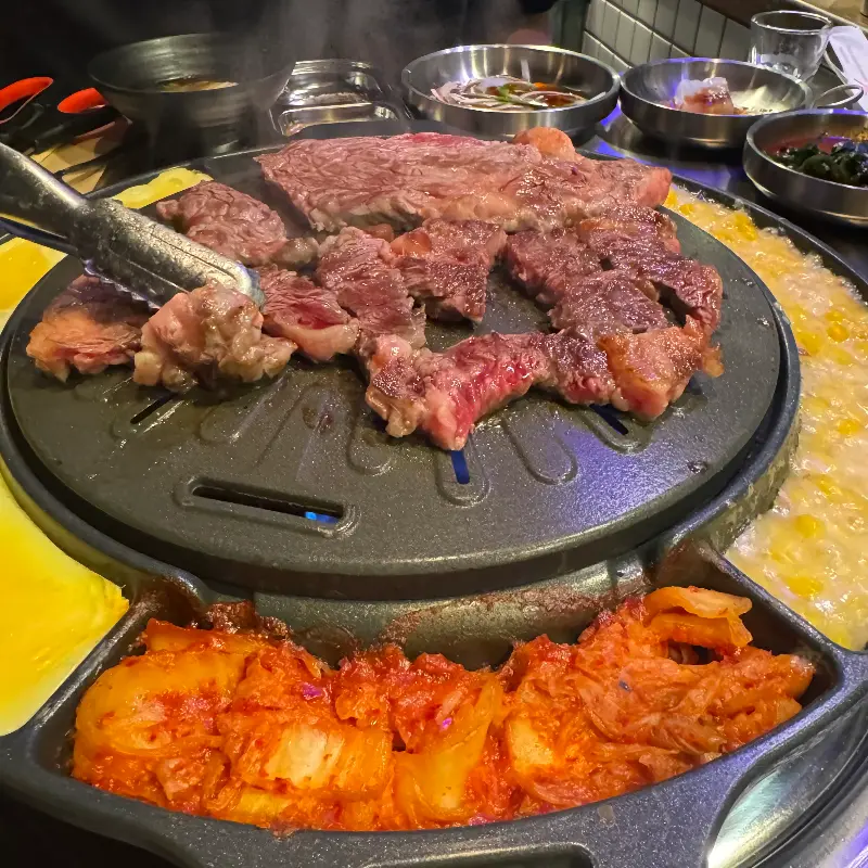 노릇하게 익어가는 삼겹살을 보니 저절로 군침이 돕니다. 잘 익은 삼겹살 한 점을 집어 입안에 넣으니, 육즙이 팡팡 터지면서 입안 가득 고소함이 퍼집니다. 정말이지, 다른 지점에서는 느껴보지 못한 최고의 퀄리티입니다. 쌈무에 싸서 먹으니 아삭한 식감과 새콤달콤한 맛이 삼겹살의 풍미를 더욱 살려줍니다.
