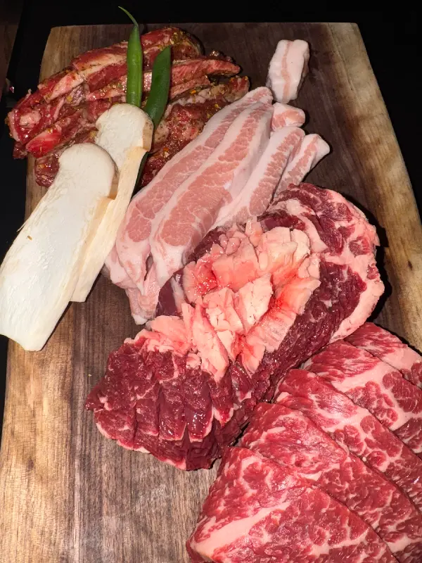 드디어 기다리던 삼겹살이 나왔습니다. 선명한 붉은 빛깔과 촘촘하게 박힌 마블링이 신선함을 그대로 보여줍니다. 마치 예술 작품을 감상하는 듯한 기분입니다. 달궈진 불판 위에 삼겹살을 올리자, 치-익 소리와 함께 고소한 냄새가 코를 자극합니다.