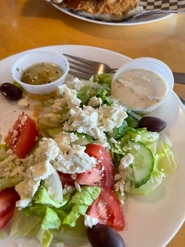 슈니첼과 함께 주문한 그릭 샐러드도 기대 이상이었다. 신선한 채소와 토마토, 오이, 양파가 듬뿍 들어 있었고, 페타 치즈와 올리브는 짭짤한 맛을 더했다. 특히 드레싱은 신선한 레몬즙과 올리브 오일로 만들어져 상큼하면서도 깔끔했다.