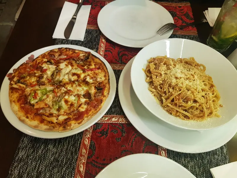 눈 앞에 펼쳐진 먹음직스러운 피자와 파스타. 여행 중 지친 입맛을 단번에 돋우는 비주얼이다.