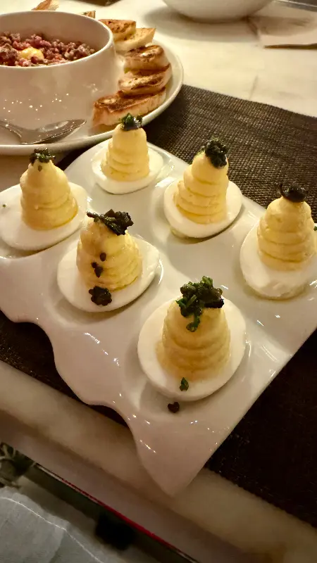 데블드 에그는 또 다른 즐거움을 선사했습니다. 앙증맞은 모양새와 섬세한 데코레이션은 먹기 아까울 정도였습니다. 부드러운 에그 필링과 위에 올려진 캐비어의 짭짤함이 어우러져 입 안 가득 풍성한 맛을 선사합니다.