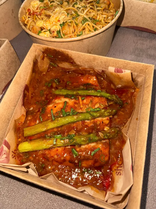 상자를 하나씩 열어보니, 더욱 감탄스러웠다. 음식 하나하나가 흐트러짐 없이 완벽한 모습으로 담겨 있었다. 특히, 음식의 색감 조화가 예술이었다. 붉은 빛깔의 양념과 초록색 아스파라거스의 조화는 식욕을 자극하기에 충분했다. 마치 잘 차려진 레스토랑 코스 요리를 보는 듯한 황홀경에 빠져들었다.