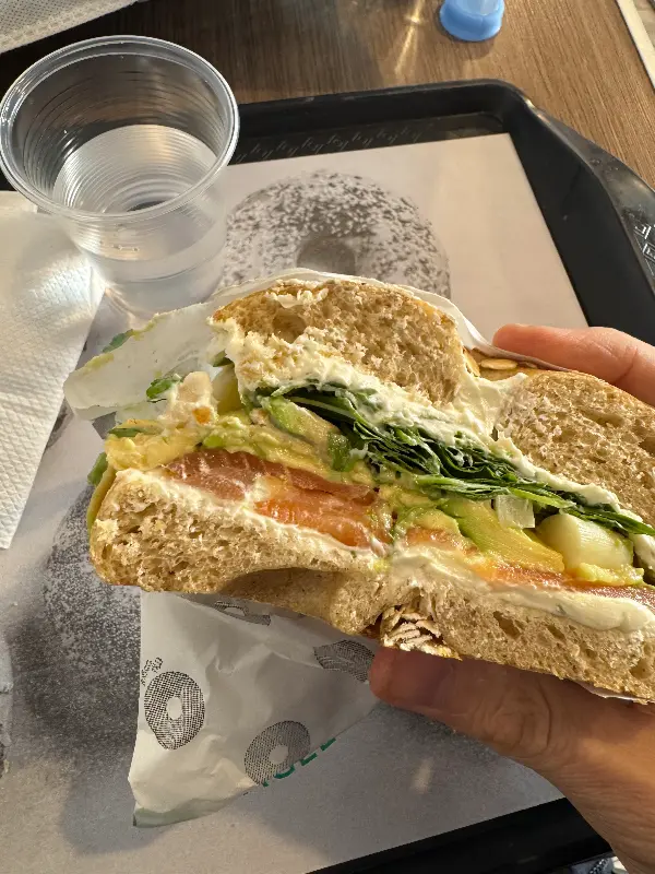 벽면 가득 채워진 베이글 진열대는 그야말로 장관이었다. 클래식한 플레인 베이글부터, 톡톡 터지는 씨앗이 박힌 베이글, 달콤한 시나몬 레이즌 베이글까지, 눈으로만 봐도 황홀경에 빠지는 듯했다. 샐러드 코너 역시 신선한 채소와 토핑들이 가득 준비되어 있어, 나만의 스타일로 샐러드를 만들 수 있다는 점이 만족스러웠다.