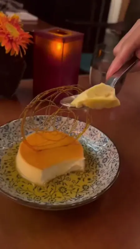 마지막으로 디저트인 플랑이 나왔다. 윤기가 흐르는 캐러멜 시럽이 덮인 플랑은 보기만 해도 달콤함이 느껴졌다. 한 입 맛보니 입안에서 사르르 녹는 부드러움과 달콤함이 황홀경을 선사했다. 특히 플랑 위에 장식된 설탕 공예는 바삭한 식감을 더해주어 맛과 재미를 동시에 느낄 수 있게 했다. 은은하게 비치는 촛불 아래 플랑을 음미하는 순간은 더할 나위 없이 행복했다.
