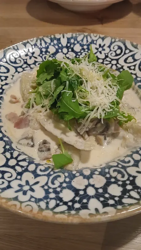 수제 라비올리는 이곳에서 꼭 맛봐야 할 메뉴 중 하나입니다. 섬세한 손길로 빚어낸 라비올리는 겉은 쫄깃하고 속은 촉촉한 완벽한 식감을 자랑합니다. 특히 시금치가 들어간 라비올리는 신선한 풍미와 건강한 느낌을 동시에 선사합니다. 라비올리에 곁들여진 소스는 살짝 묽은 편이지만, 라비올리의 풍미를 더욱 돋보이게 해줍니다. 빵과 함께 먹으면 더욱 맛있게 즐길 수 있지만, 빵이 제공되지 않는 점은 조금 아쉽습니다.