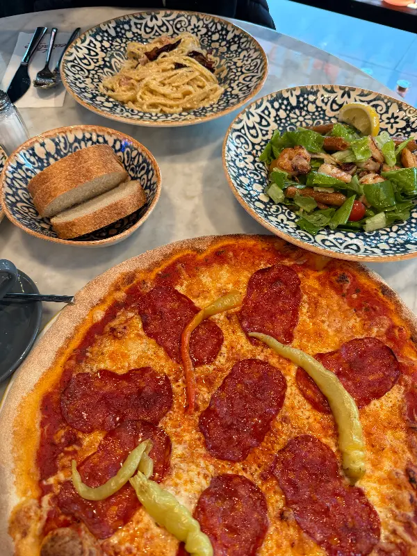 남편은 이곳에 오면 항상 디아볼로 피자를 주문합니다. 큼지막한 크기의 피자는 보기만 해도 배가 부릅니다. 얇고 바삭한 도우 위에 토마토소스, 모짜렐라 치즈, 그리고 매콤한 살라미가 듬뿍 올려져 있습니다. 한 조각을 들어 올리자 치즈가 쭉 늘어지고, 코를 자극하는 매콤한 향이 식욕을 돋웁니다. 입안 가득 퍼지는 풍미는 왜 이곳 피자가 인기 있는지 단번에 알 수 있게 해줍니다. 특히 갓 구워져 나온 따끈한 피자는 그 맛이 더욱 일품입니다.