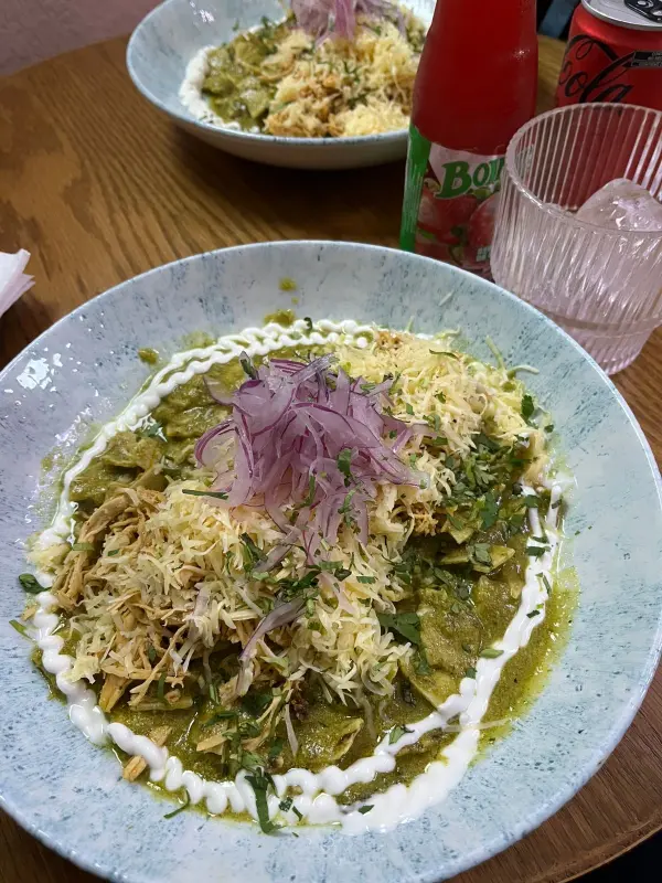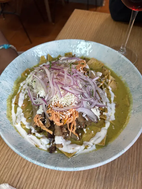 치킨을 곁들인 칠라킬레스를 주문했는데, 콩과 빵이 함께 제공된다고 했습니다. 하지만, 콩의 양은 너무 적었고, 빵은 눅눅했습니다. 음식은 미지근했고, 맛은 그저 그랬습니다. 하지만, 서빙 직원들은 매우 세심했고, 식당 분위기는 좋았습니다. 다만, 화장실이 하나뿐이었고, 화장지도 없었던 점은 아쉬웠습니다.